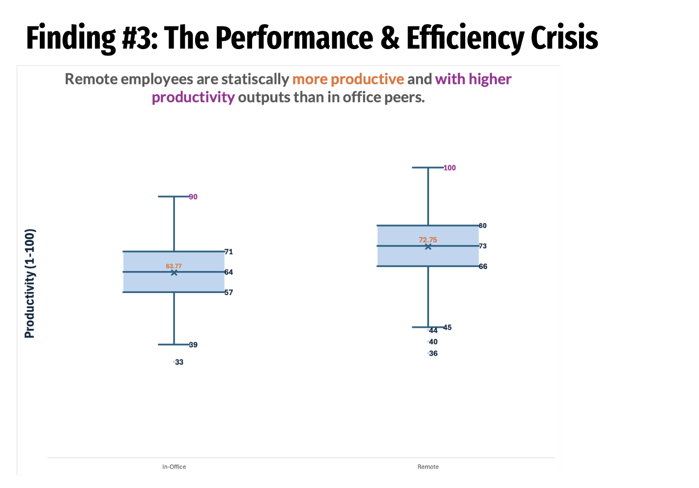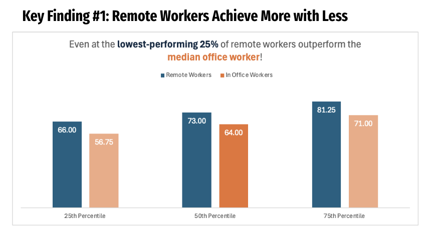Using synthetic workforce data (N=987), this study examines productivity, wellbeing, and efficiency differences between remote and in-office employees. Results demonstrate remote workers achieve statistically significant performance advantages while working fewer hours, suggesting traditional office-centric assumptions may underestimate remote work effectiveness.